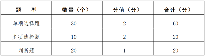 1.試題類型包括:單項選擇題、多項選擇題、判斷題,全部為客觀題。多項選擇題中,全部選對得2分;少選,所選的每個選項得0.5分;多選、錯選不得分。題型數(shù)量及分值見下表。