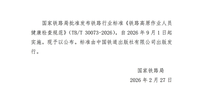 國家鐵路局批準發布鐵路行業標準《鐵路高原作業人員健康檢查規范》(TB/T 30073-2026)。